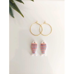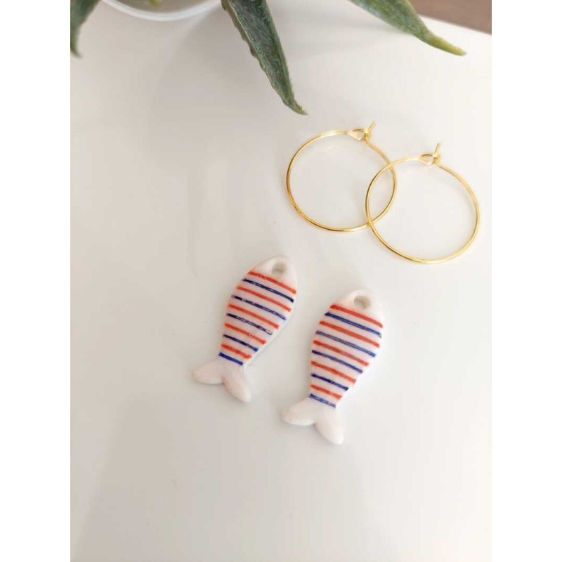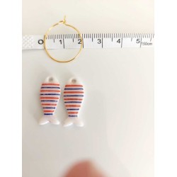 pendiente en arcilla polimérica en forma de pez en color blanco con detalles en rojo y azul.