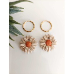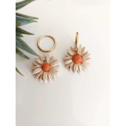 pendiente en arcilla polimérica en forma de margarita en tonos beige.