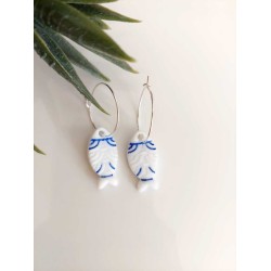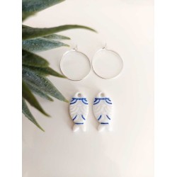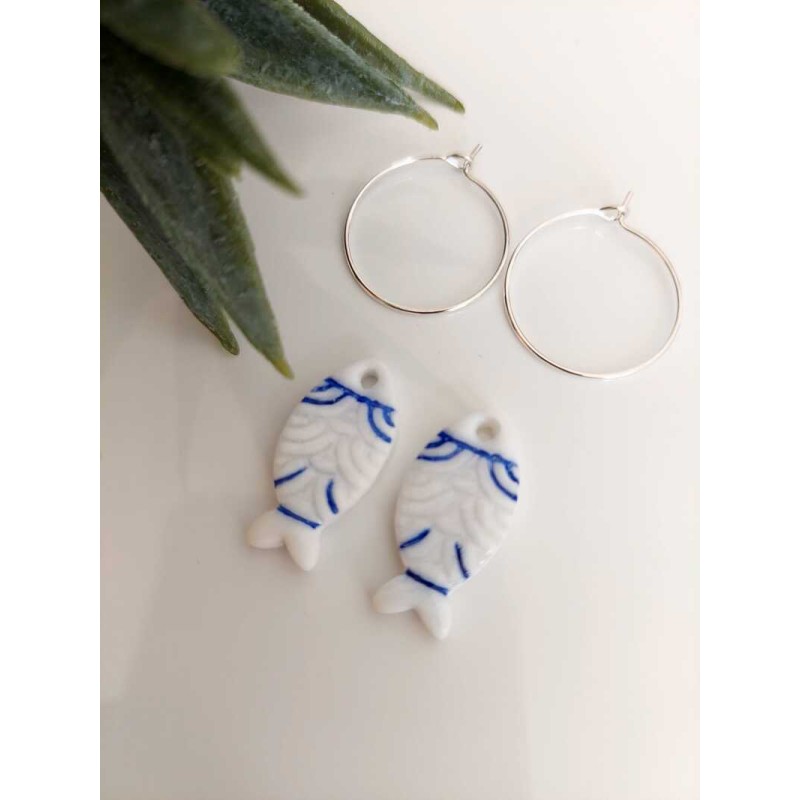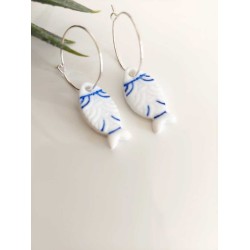 Pendiente en arcilla polimérica en forma de pez en color blanco y detalles en color azul.